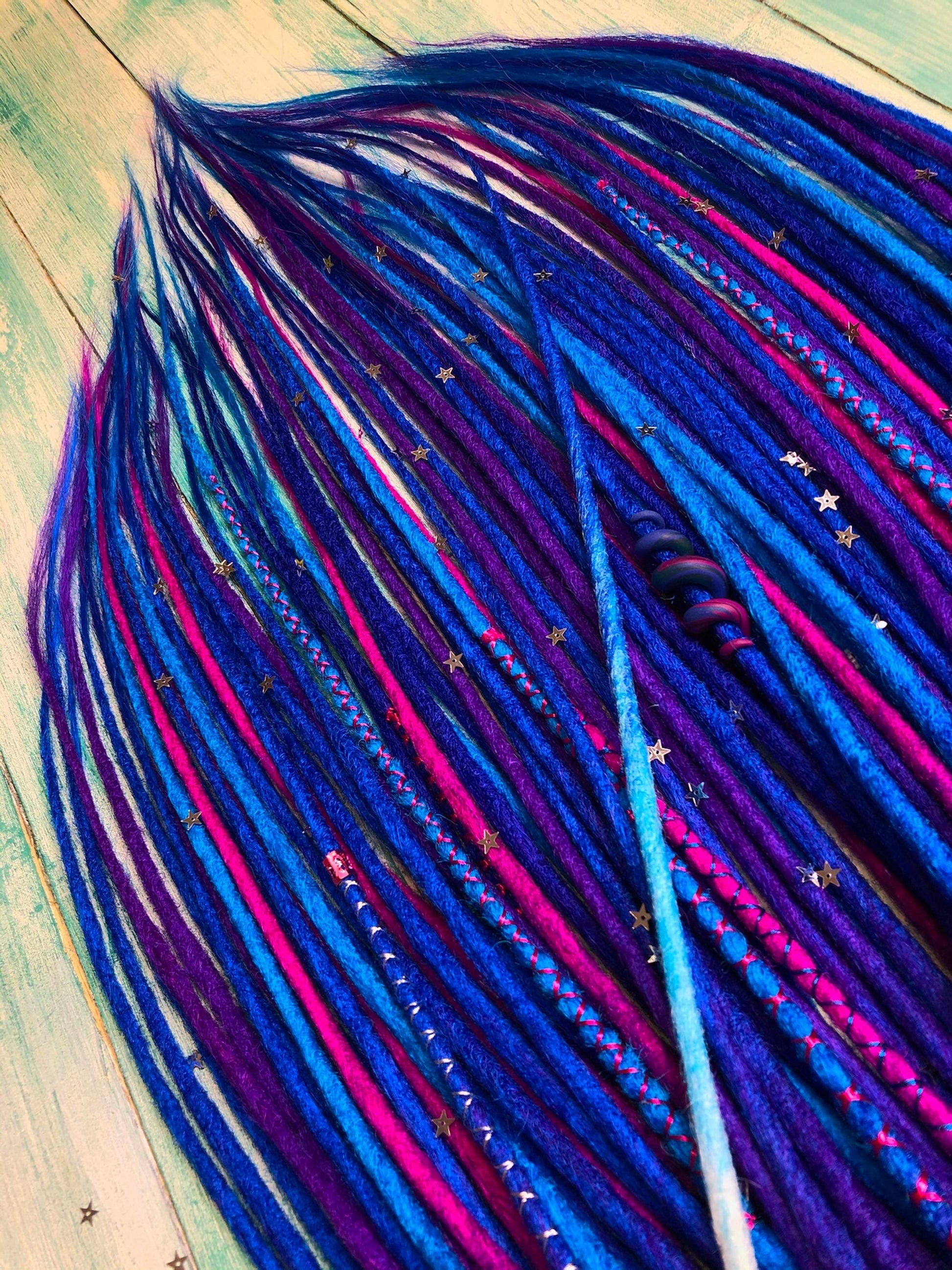 Handmade synthetic dreadlocks in deep blue and purple tones with a cosmic ombre effect, inspired by space aesthetics and celestial themes.