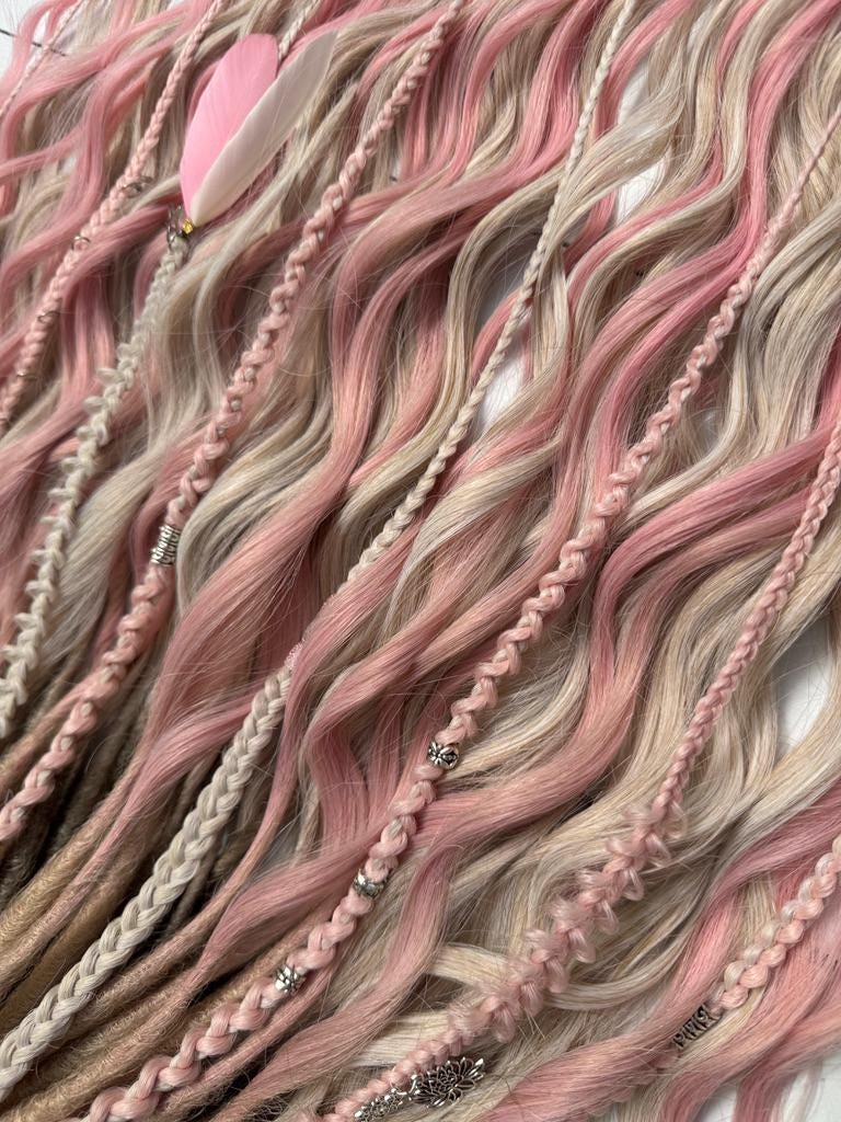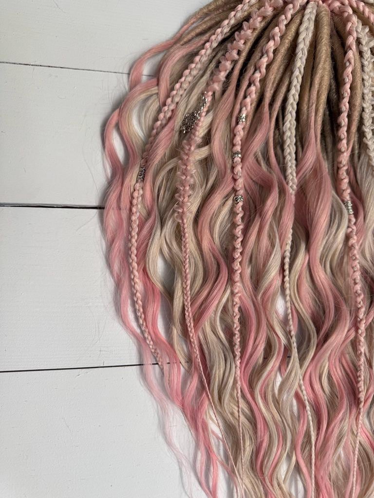 Synthetic dreadlock curls in blush pink and beige tones with soft texture and delicate decorative details for gentle, romantic styling.