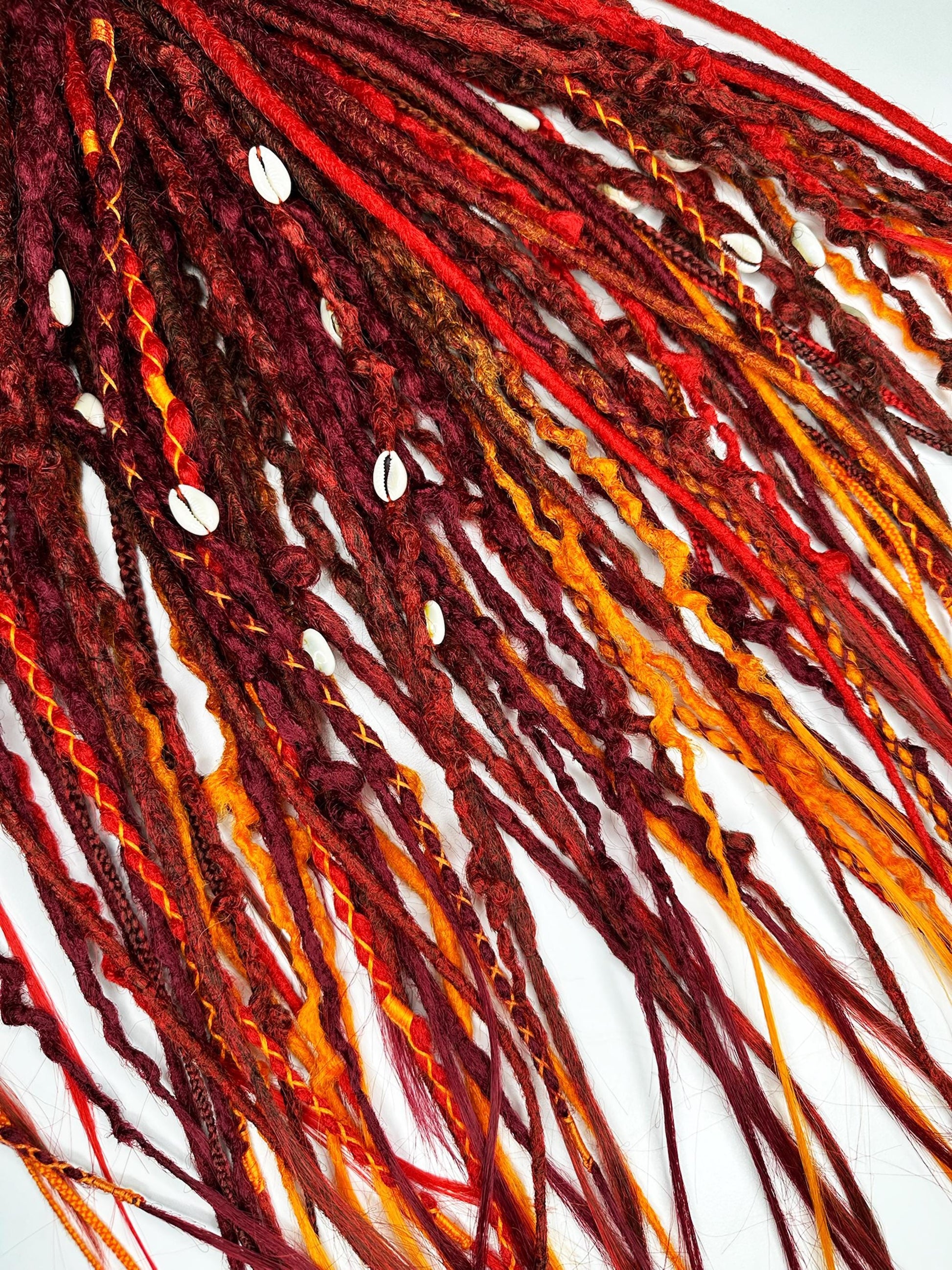 Warm-toned synthetic dreadlocks featuring a rich ombre blend of burgundy, red, orange, and soft blonde accents. Textured, vibrant, and expressive, perfect for boho styles, festivals, creative looks, and statement hairstyles.