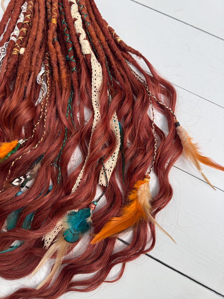 Copper Brown Dreadlock Extensions with Crochet Dreads, Feathers, and Lace