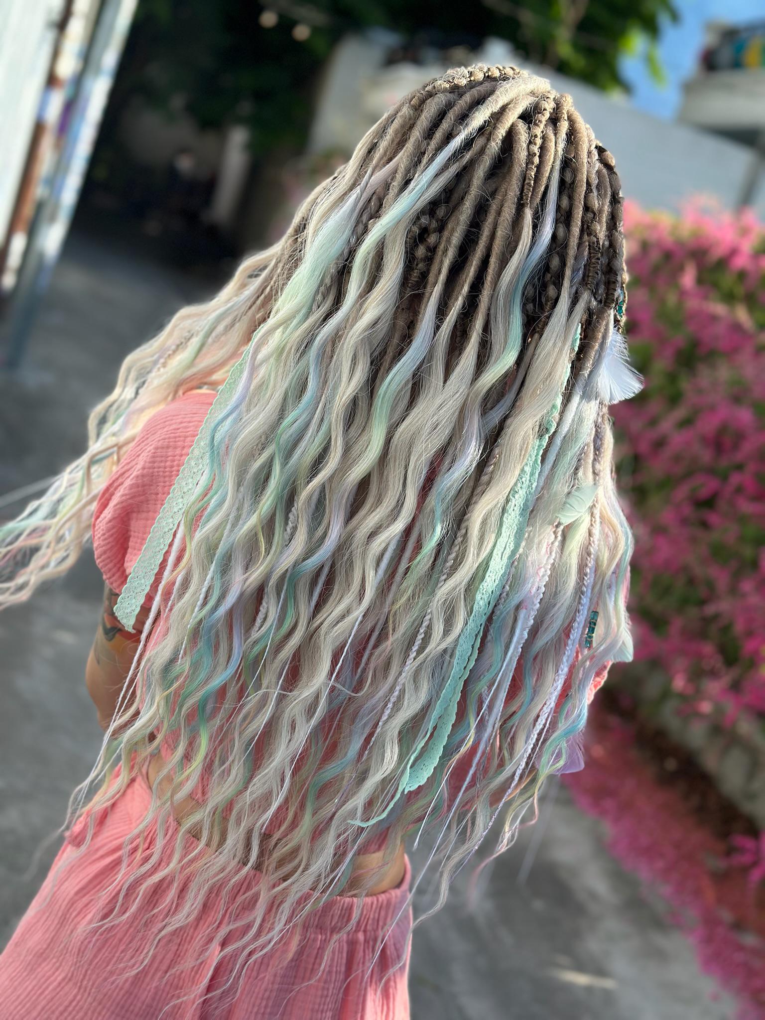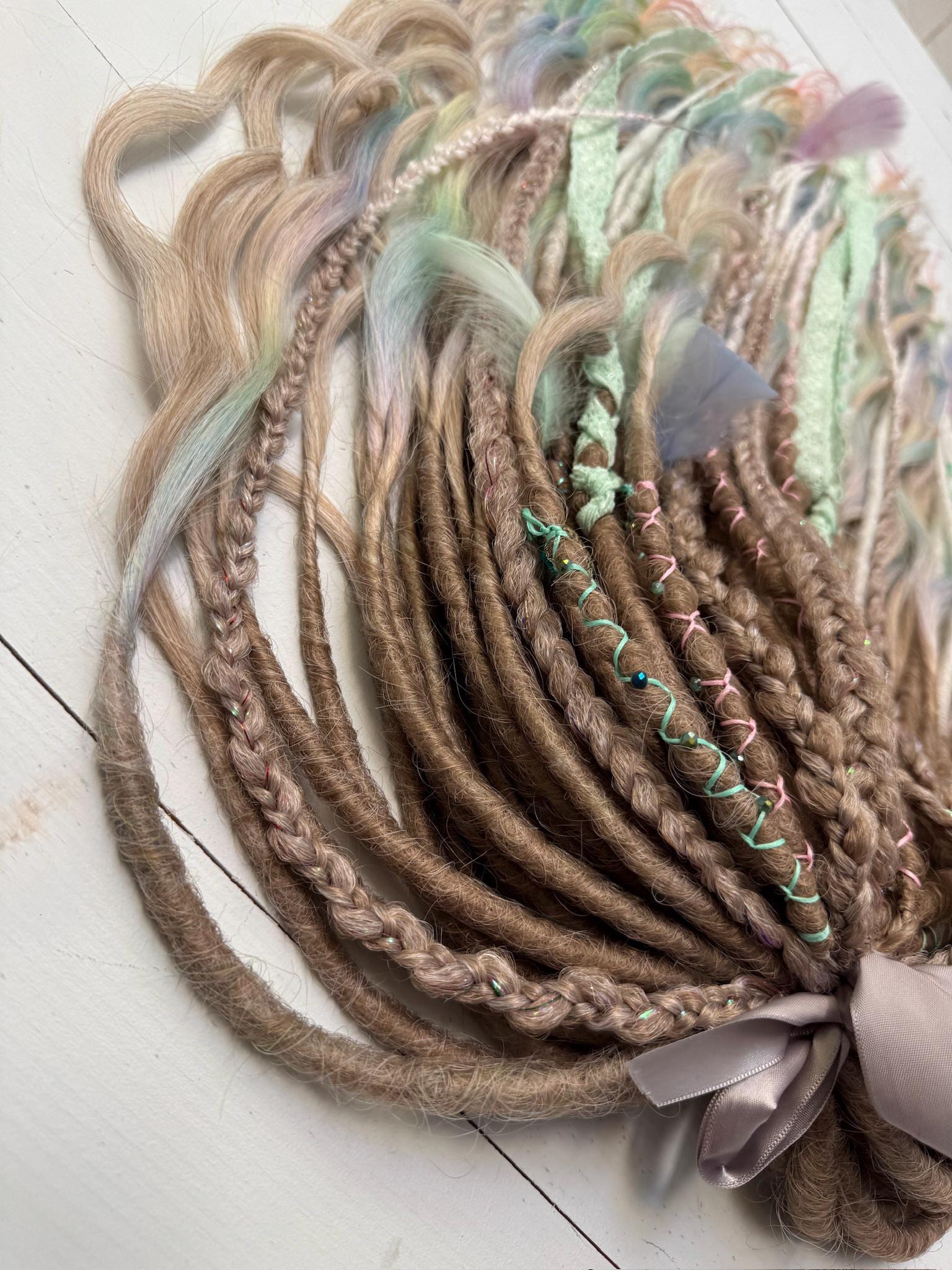 Blonde synthetic dreadlock extensions with soft pastel rainbow accents, mixed textures, and an airy fairycore aesthetic for expressive styling.