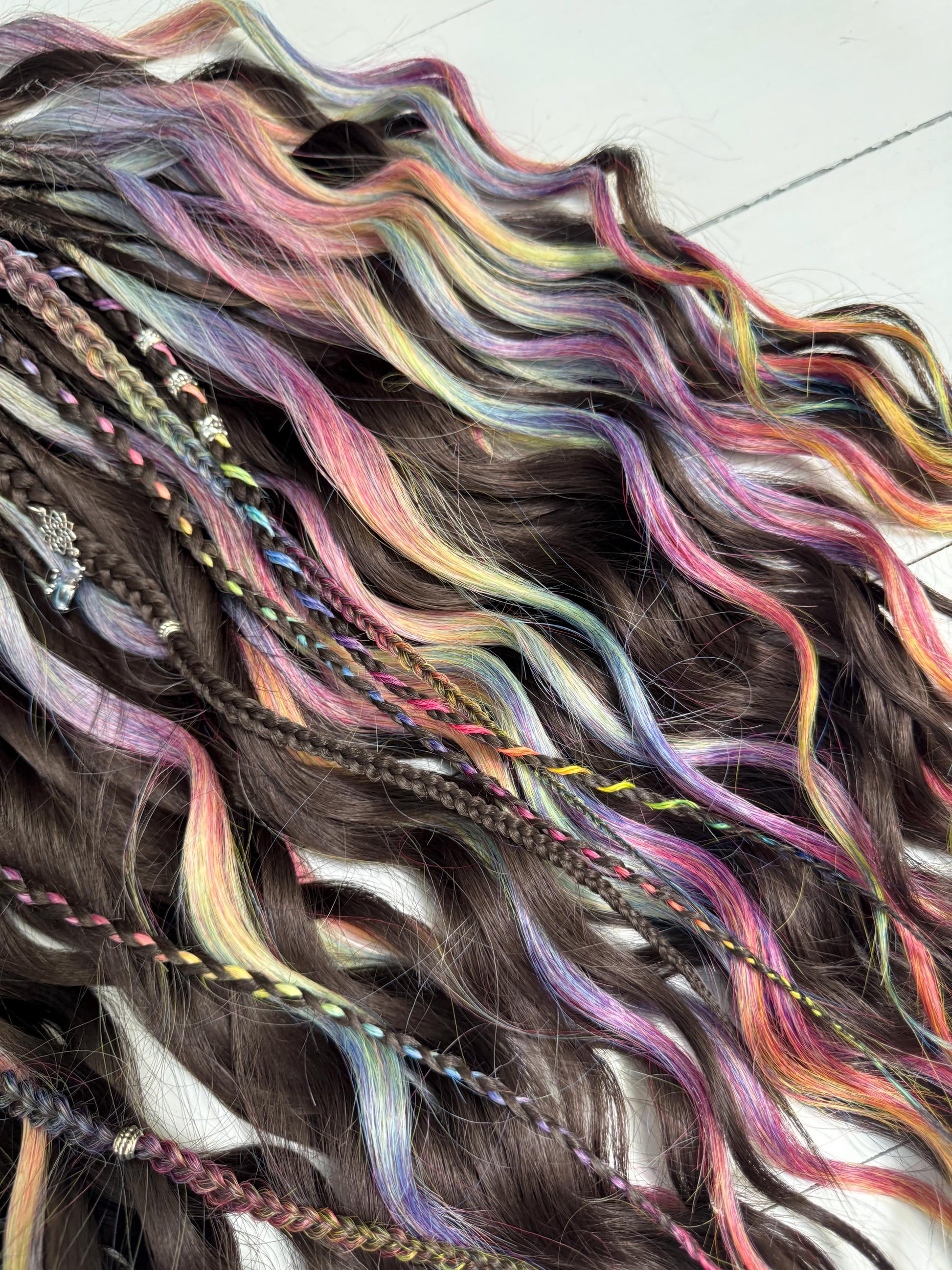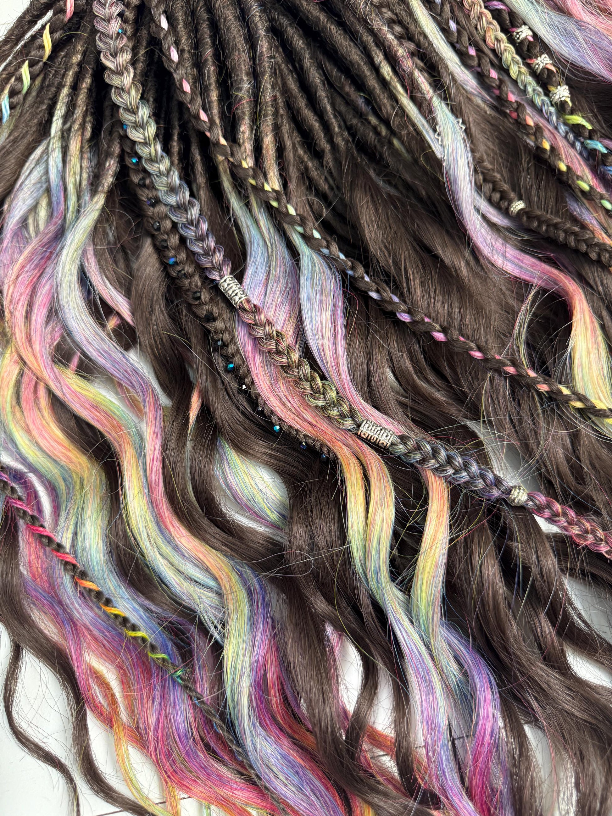 Handmade synthetic dreadlock curls with a dark brown base and rainbow highlights, decorated with braided elements, beads, rings, and charms. Lightweight, reusable, and comfortable for boho, fantasy, and festival hairstyles.