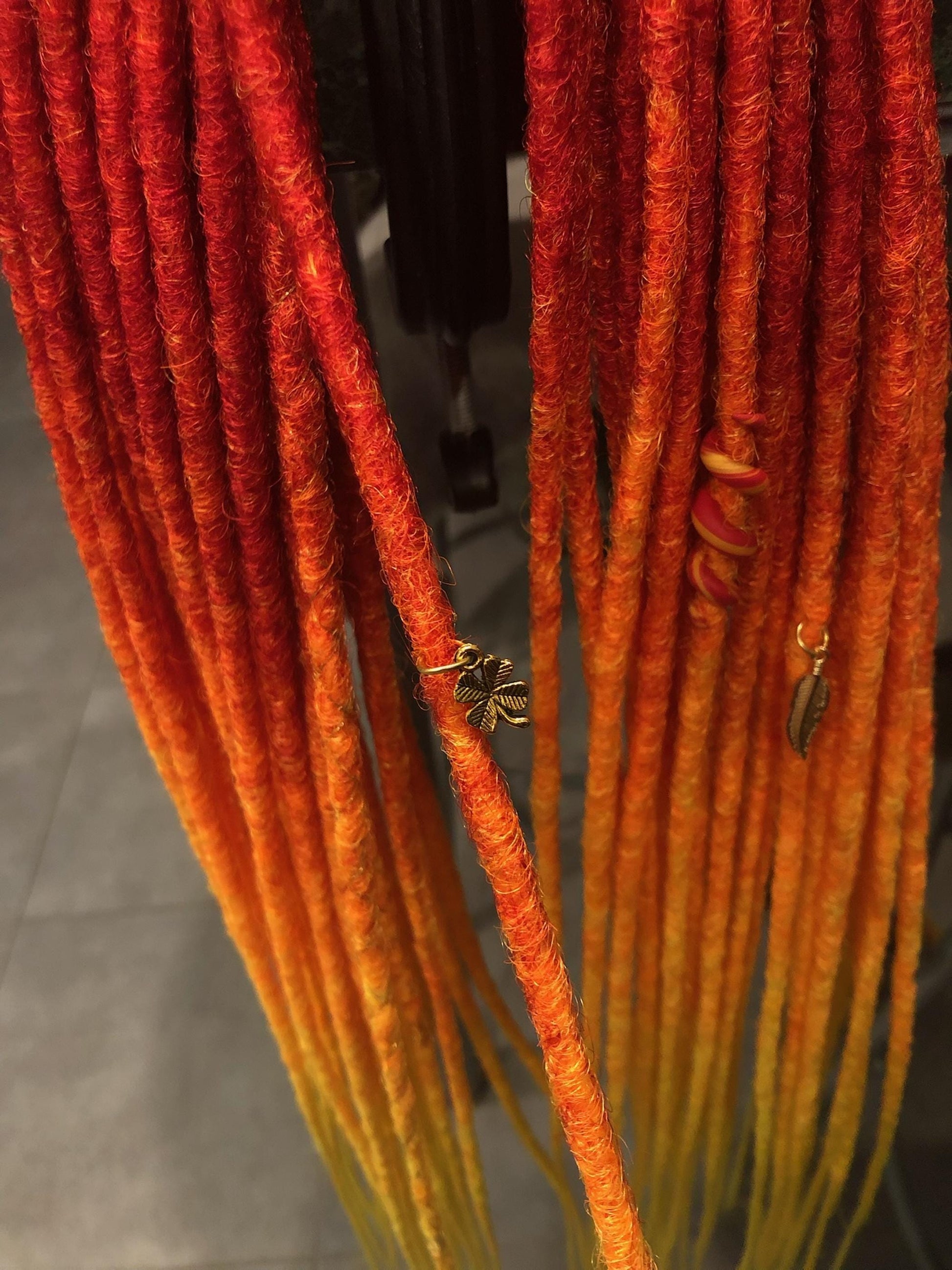 Handmade DE/SE synthetic dreadlocks in a red orange yellow fire ombre palette with a textured finish for bold boho, ritual, and festival hairstyles.