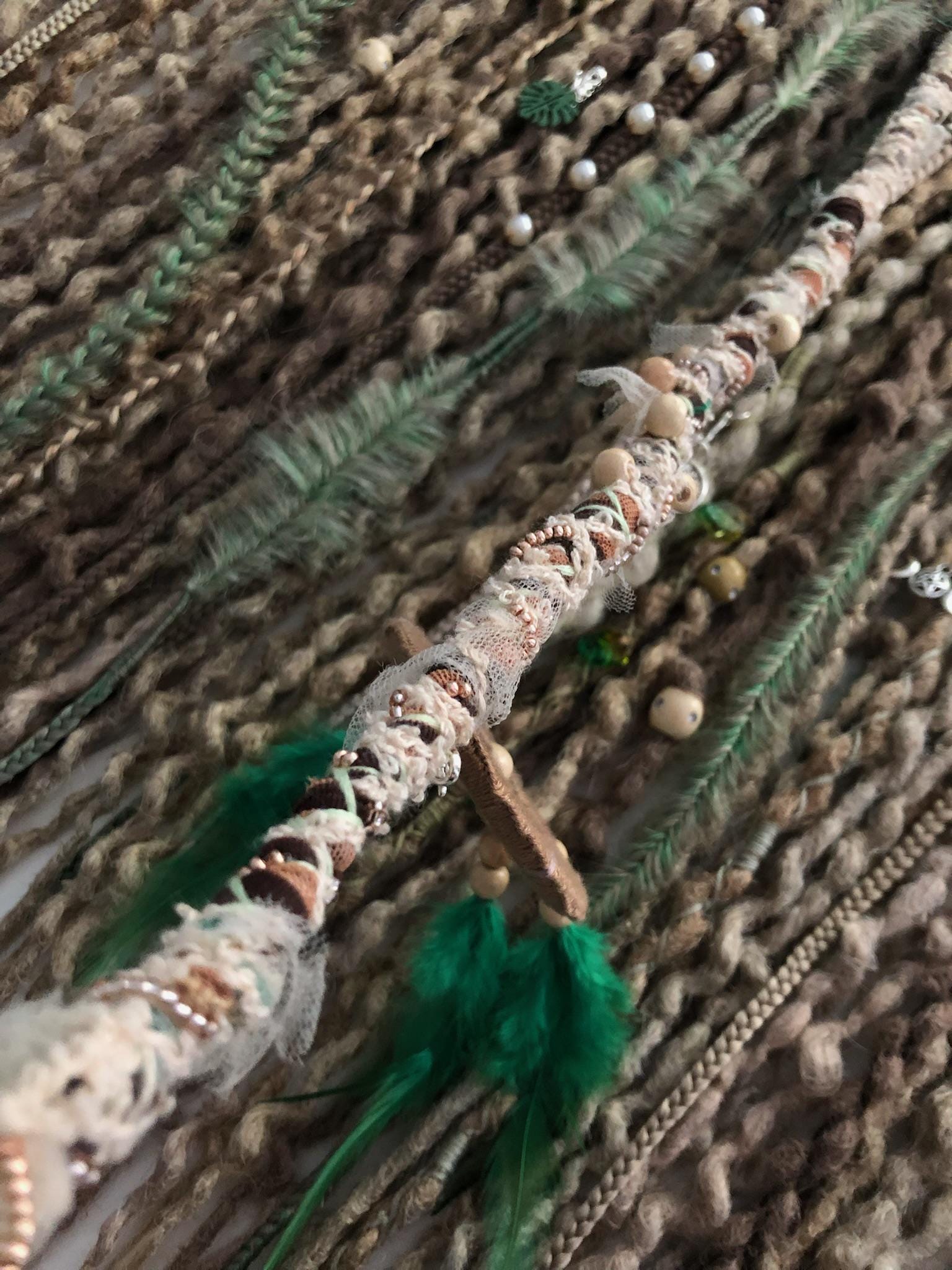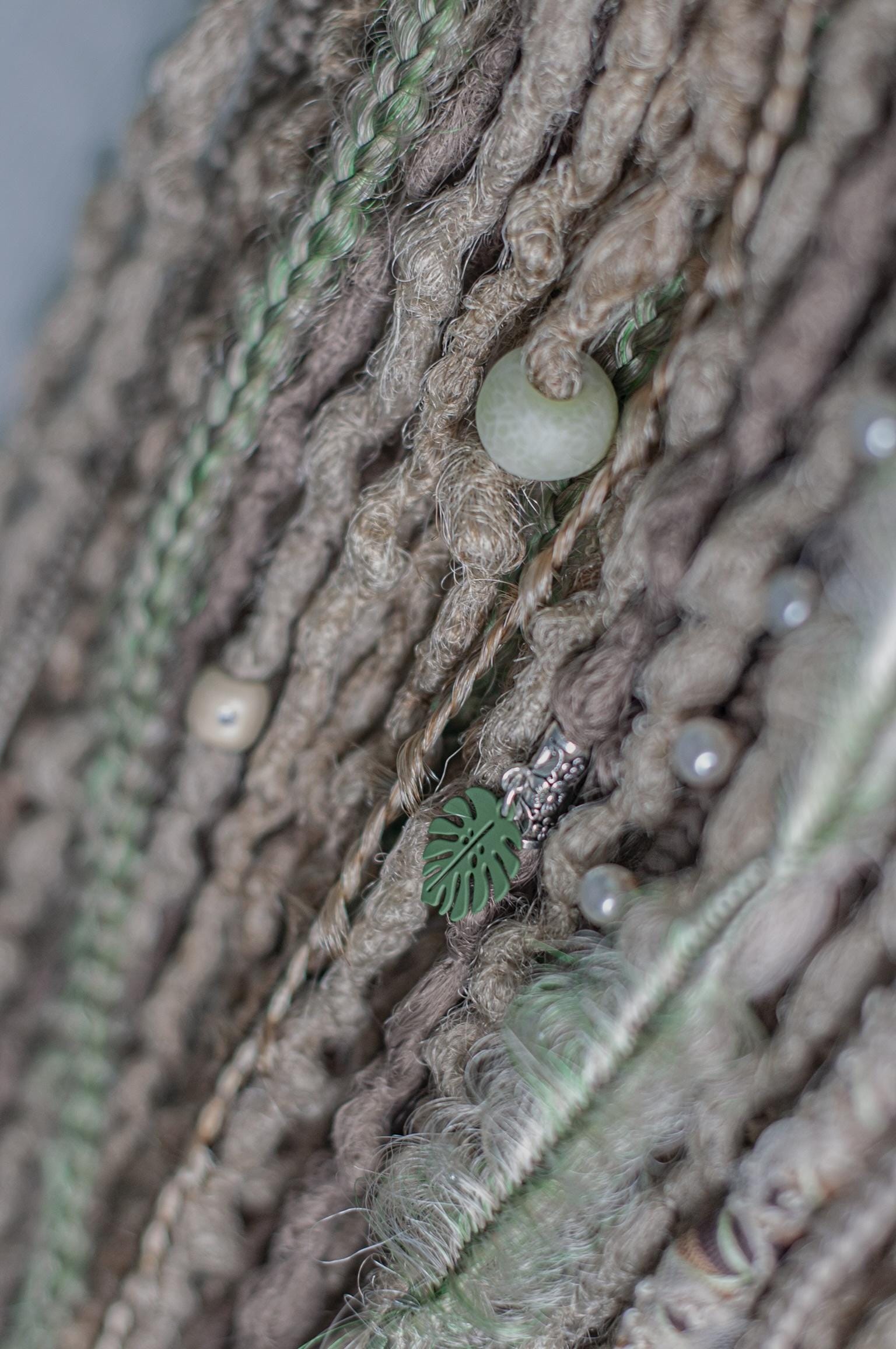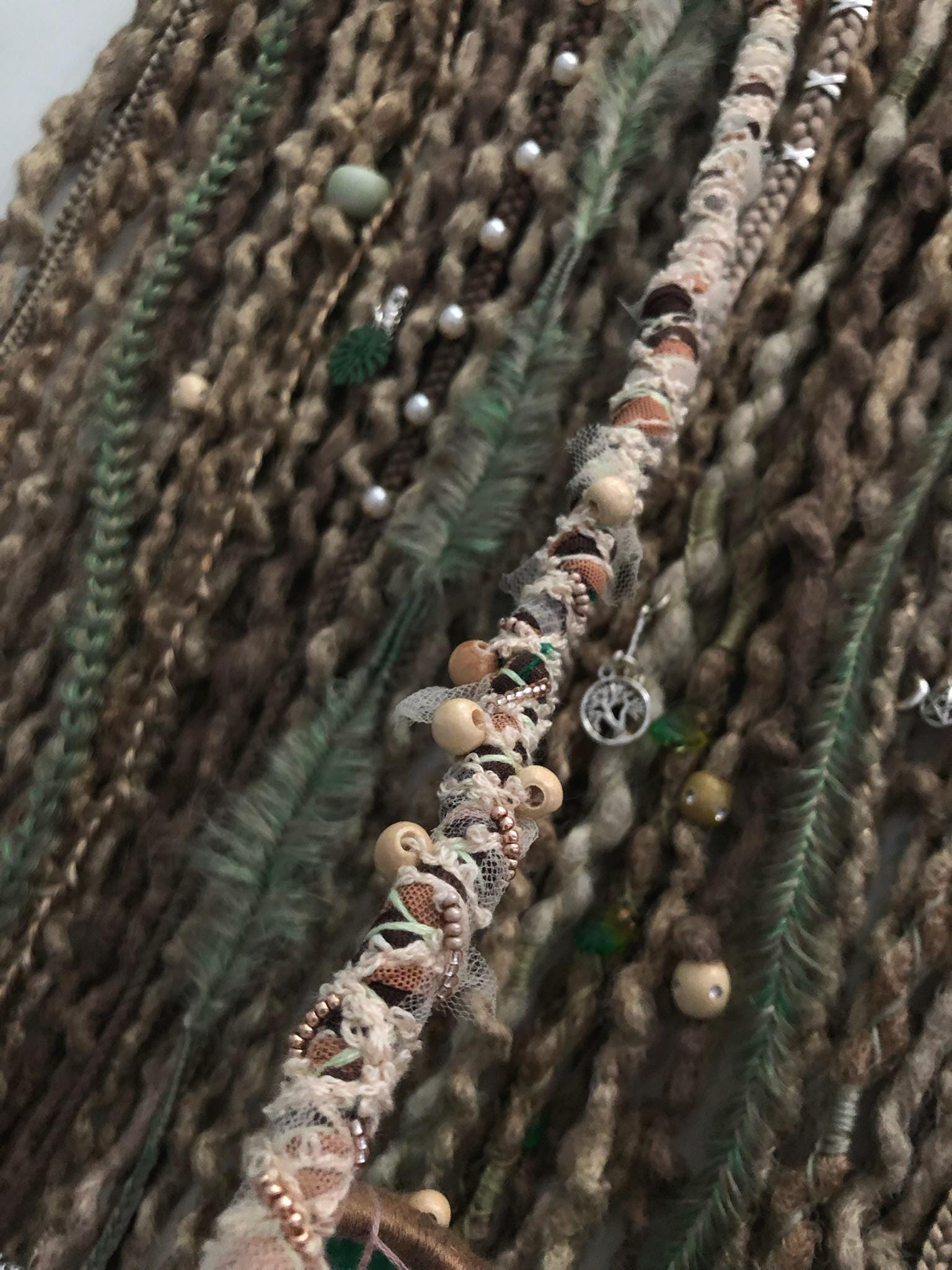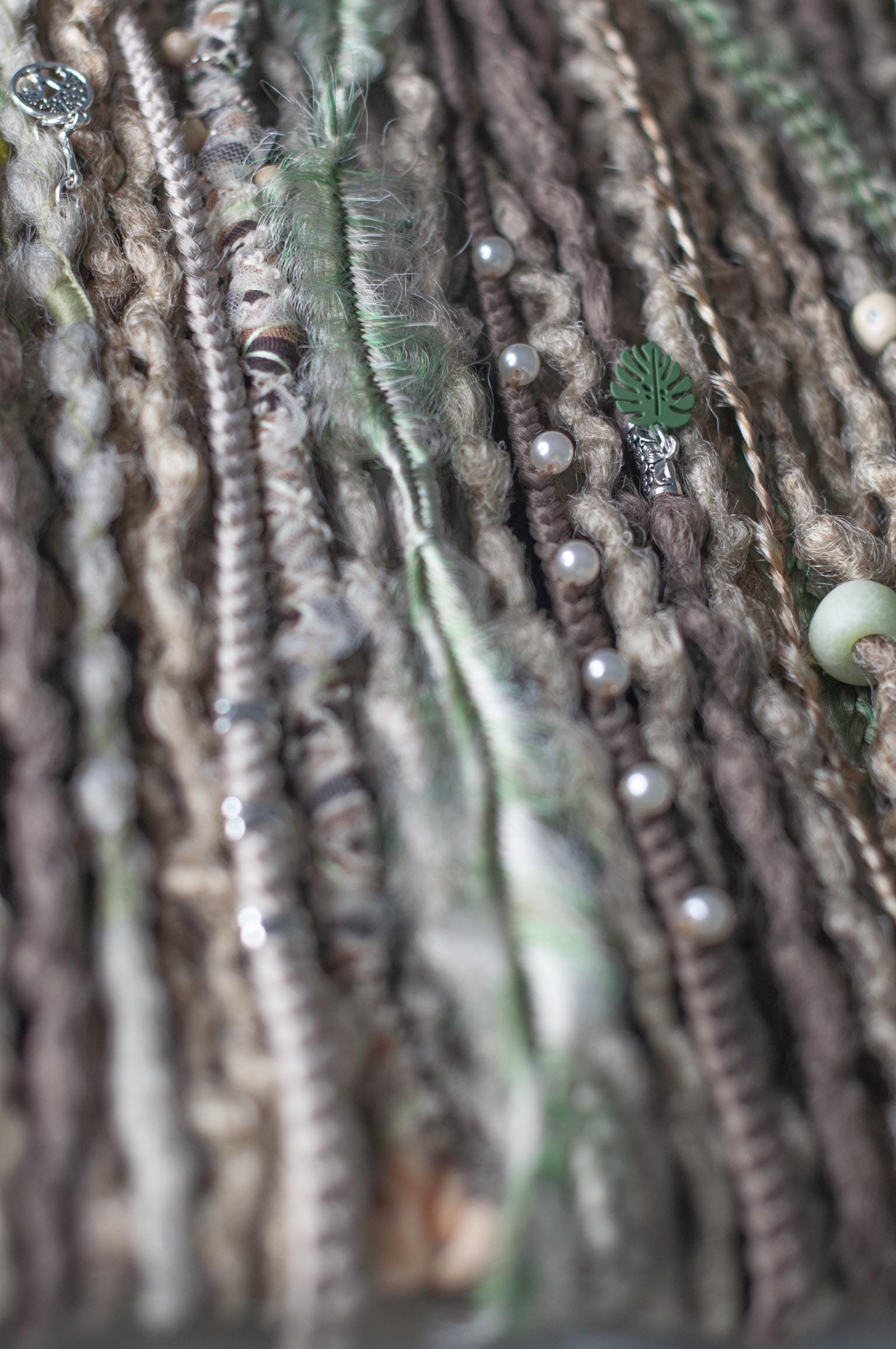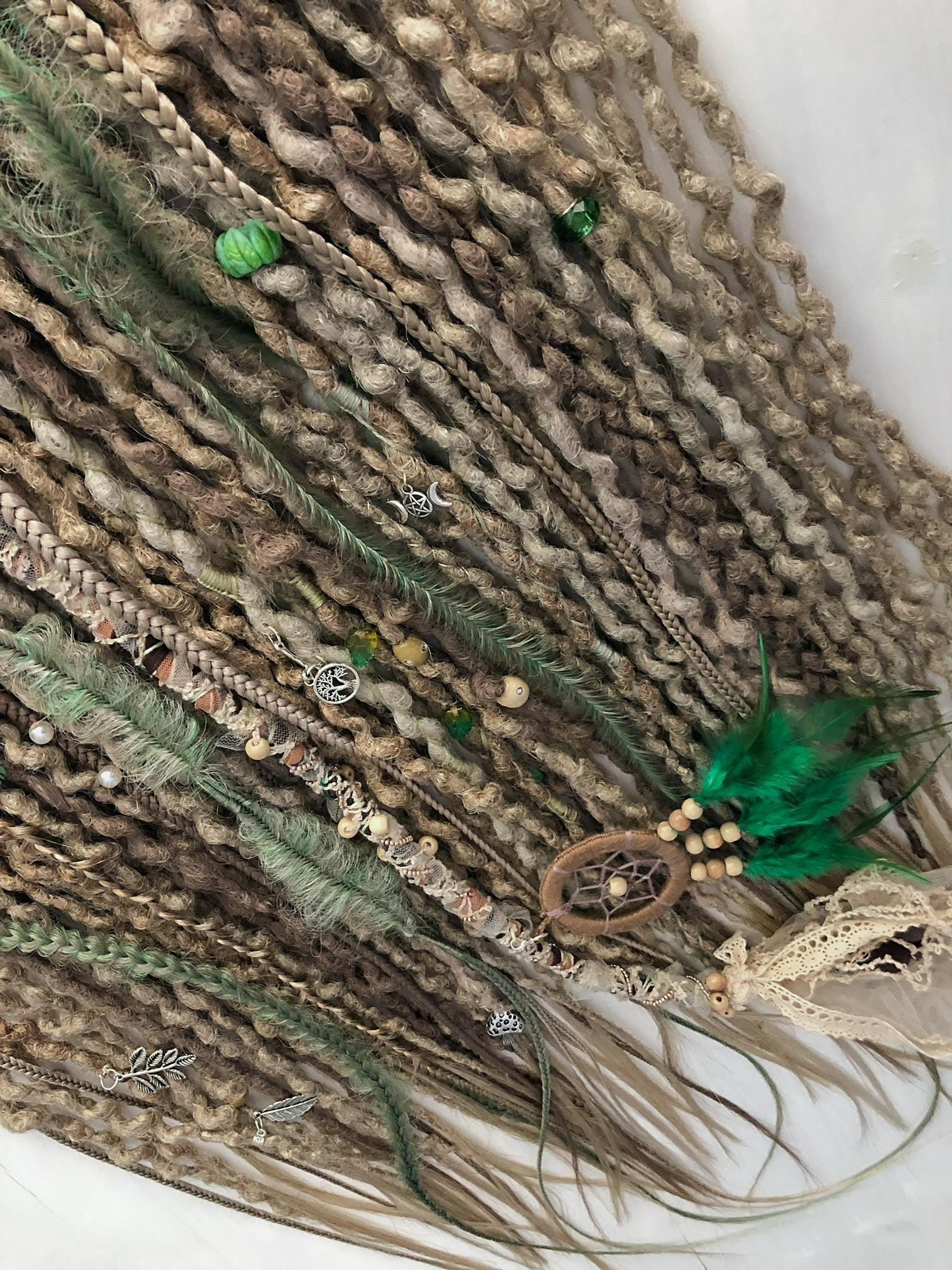 Handmade synthetic dreadlocks in forest-inspired shades of pale green and light blonde, created for natural earthy and boho looks.