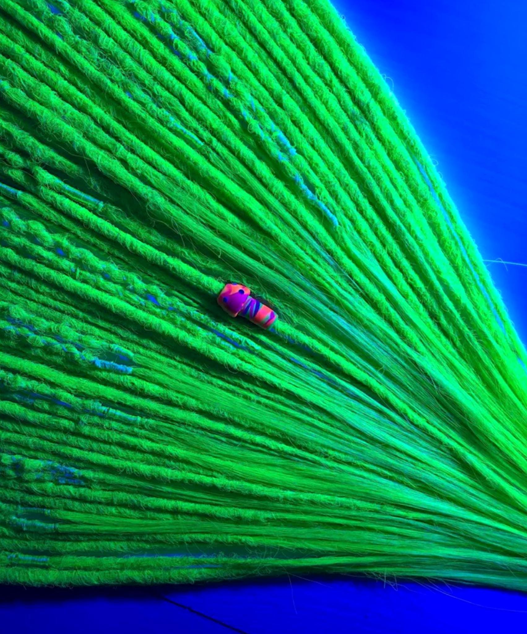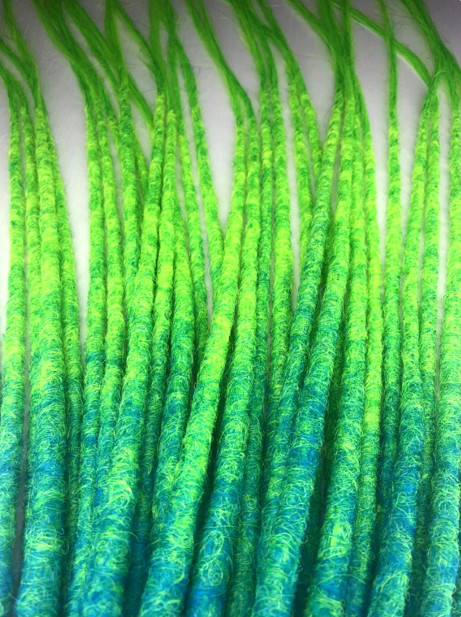 UV-reactive dreadlocks with a blue to acid green ombre that glow under blacklight and LED, designed for raves, festivals and psychedelic looks.