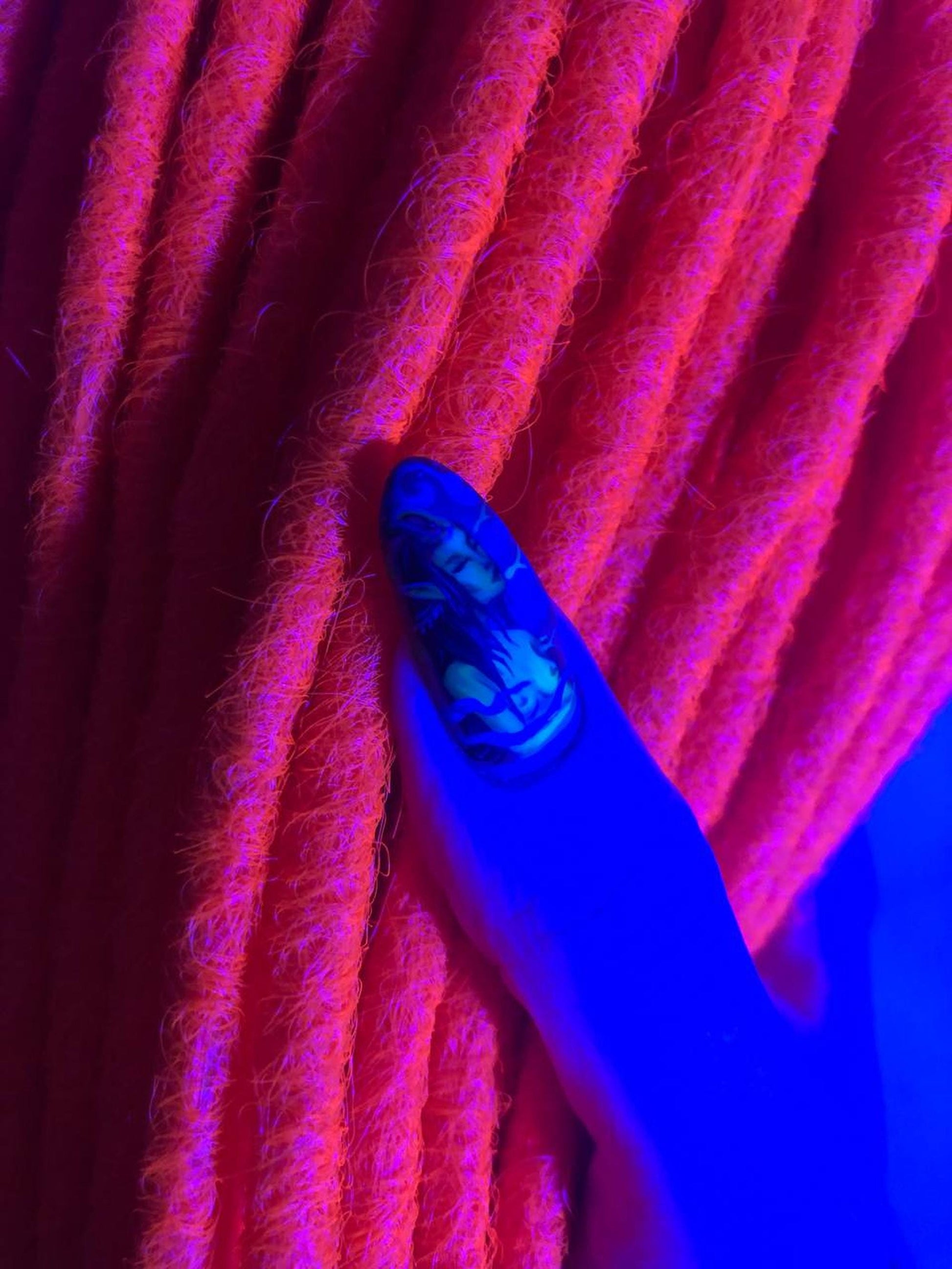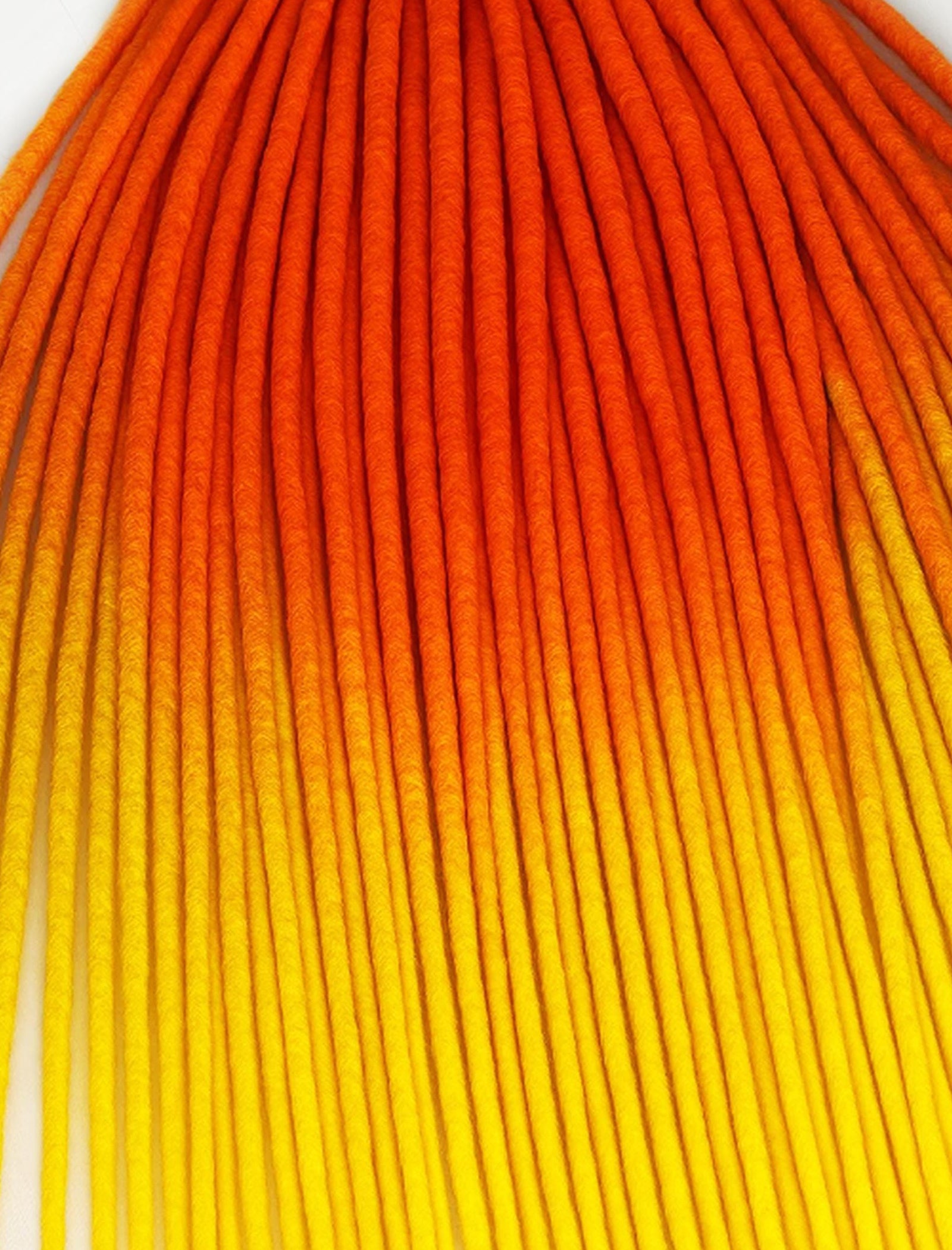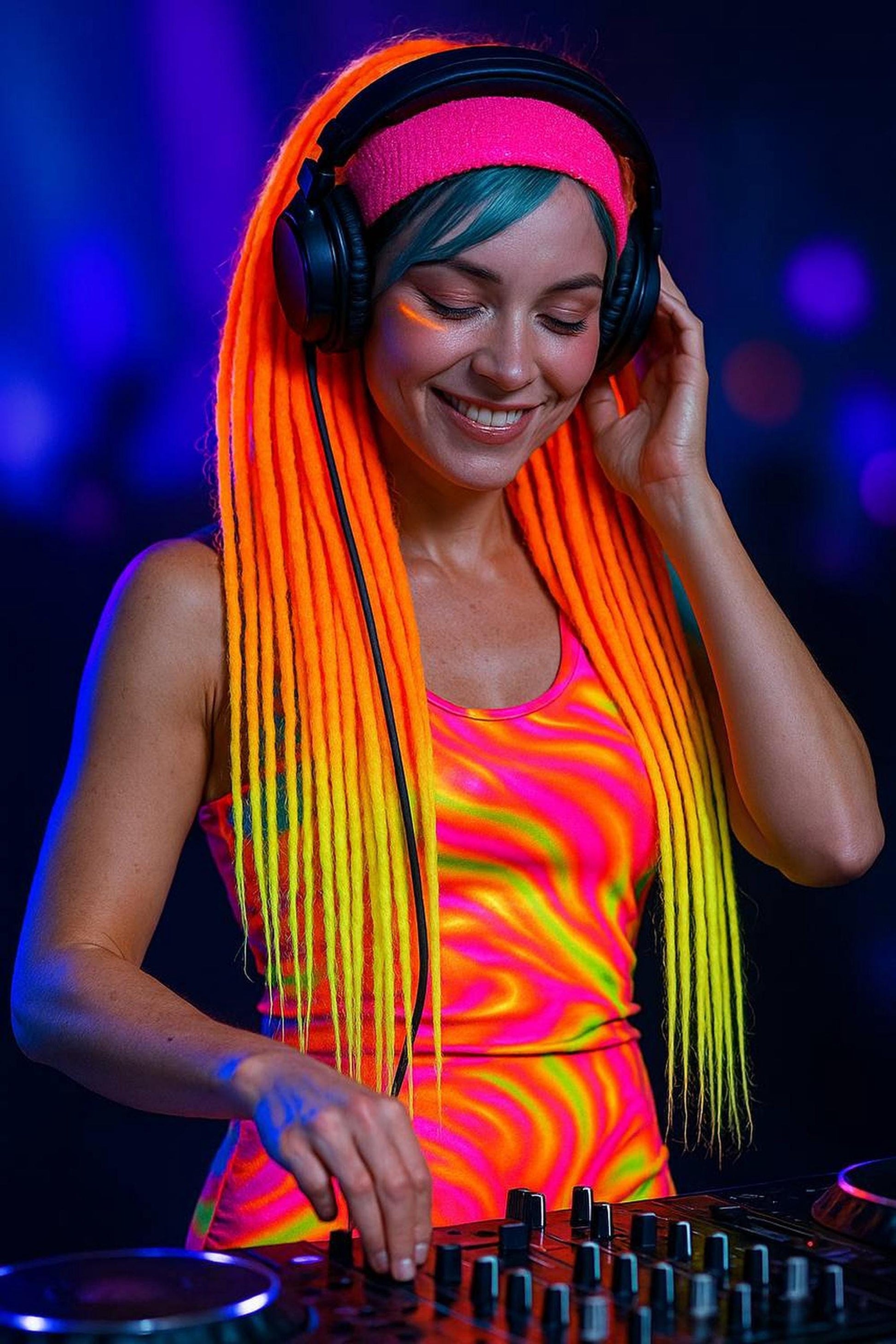 UV-reactive dreadlocks with a neon orange to yellow ombre that glow under blacklight, created for festivals, raves and bold alternative looks.